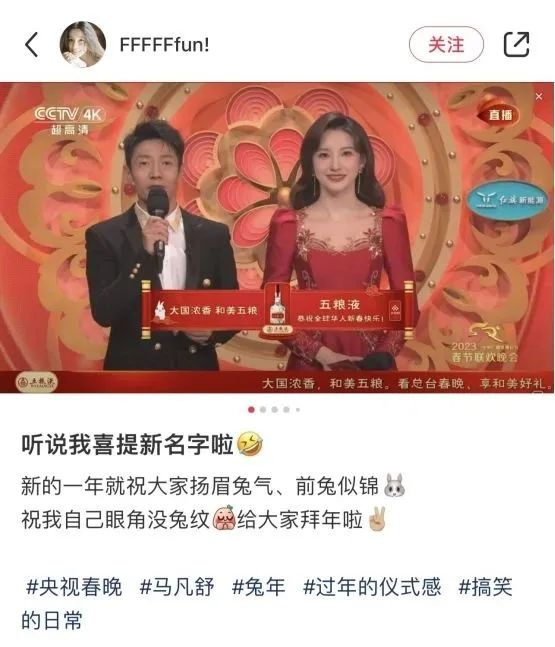 諸多關(guān)于春晚的吐槽中,有一條是關(guān)于五糧液廣告的。不少網(wǎng)友戲稱,“喜歡這個(gè)叫五糧液的主持人”,還有不明真相的群眾疑惑,“這年頭姓五的不多啊”。