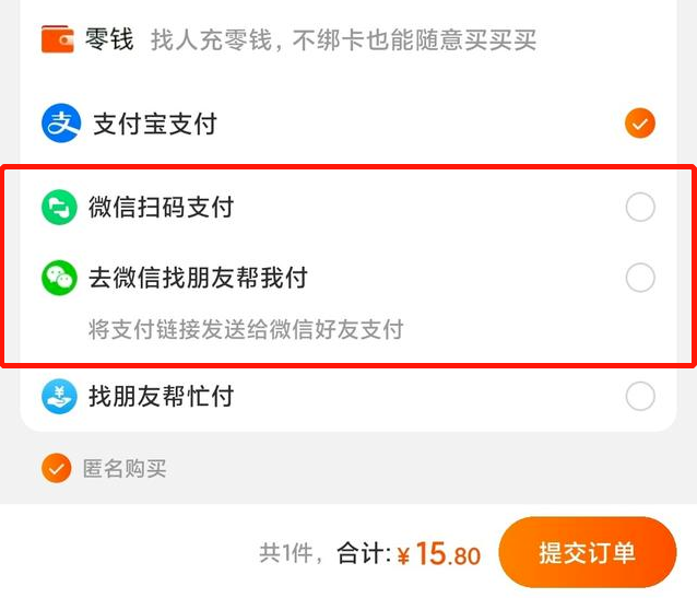 相較于之前的支付方式,新版淘寶 App在訂單提交頁面,展示了“微信掃碼支付”和“去微信找朋友幫我付”這兩種方式。