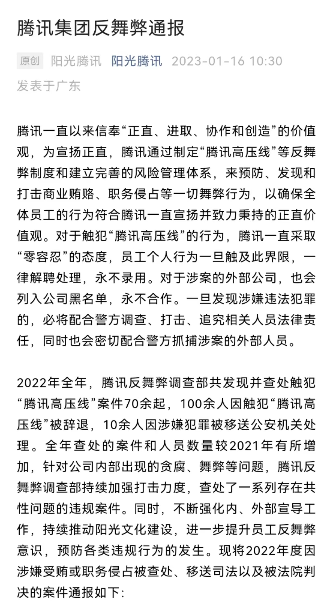 1月16日,根據(jù)“陽光騰訊”公眾號發(fā)布,2022年全年,騰訊反舞弊調(diào)查部共發(fā)現(xiàn)并查處觸犯“騰訊高壓線”案件70余起,100余人因觸犯“騰訊高壓線”被辭退,10余人因涉嫌犯罪被移送公安機關(guān)處理,推文中通報了18起案件,以及23家2022年新增永不合作企業(yè)。