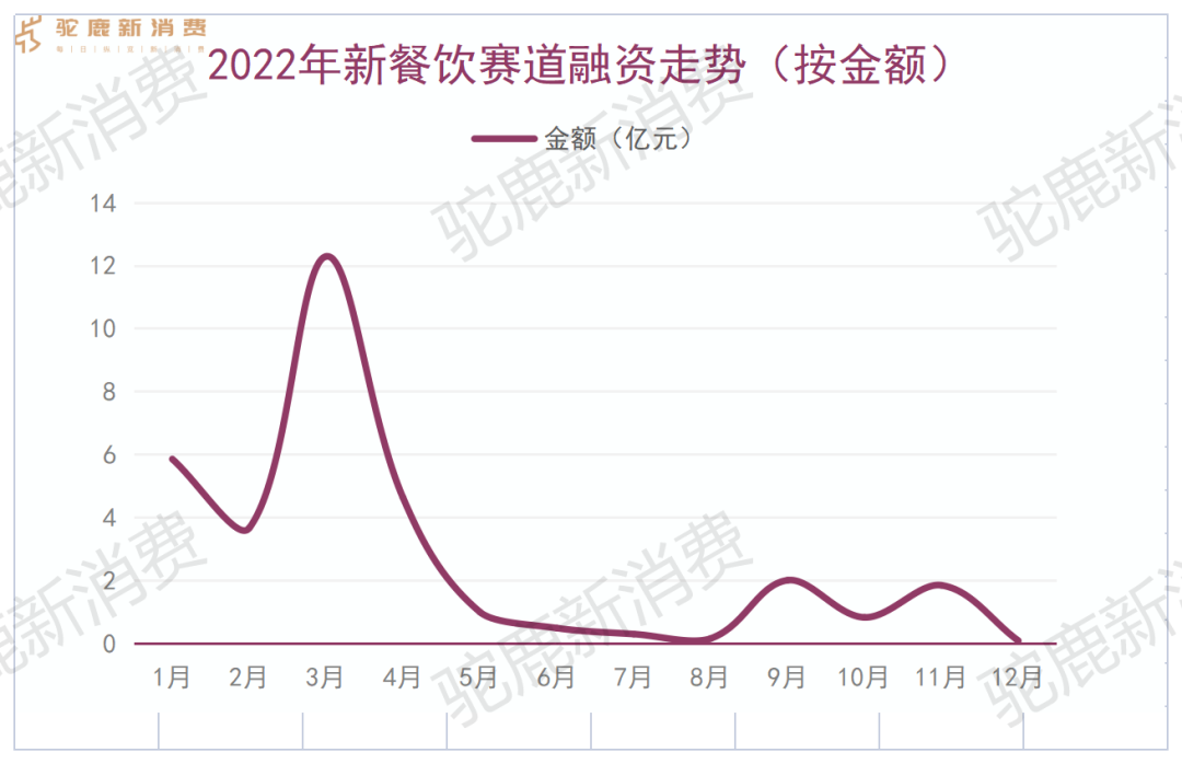 若按照融資金額比較,3月份為新餐飲賽道融資高峰,單月有12.3億元融資流入新餐飲賽道,8月份則新餐飲賽道融資低谷,單月僅有0.16億元進(jìn)入新餐飲賽道。平均每月進(jìn)入新餐飲賽道的熱錢約為2.77億元。