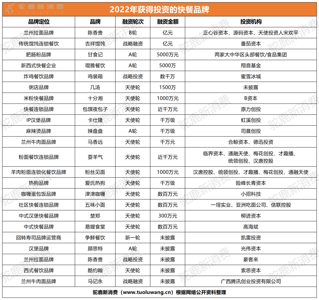 根據(jù)駝鹿新消費(fèi)不完全統(tǒng)計(jì),2022年共有22家快餐品牌獲得融資,根據(jù)已披露融資金額的企業(yè)估算,總計(jì)獲得超過4.37億元的融資。