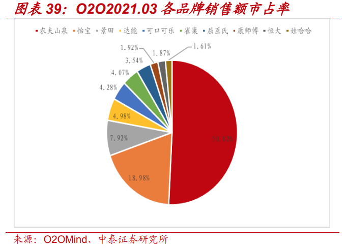 此外,在新零售渠道的推動下,農(nóng)夫山泉在家庭場景的集中度將進(jìn)一步提升。根據(jù)中泰證券的研報,農(nóng)夫山泉在O2O平臺上的銷售額市占率超過了50%,而時代周報記者在對各產(chǎn)品進(jìn)行查詢的時候也發(fā)現(xiàn),相較于其他品牌,農(nóng)夫山泉的價格體系似乎最為透明,覆蓋范圍最為廣泛,購買也最為便捷。