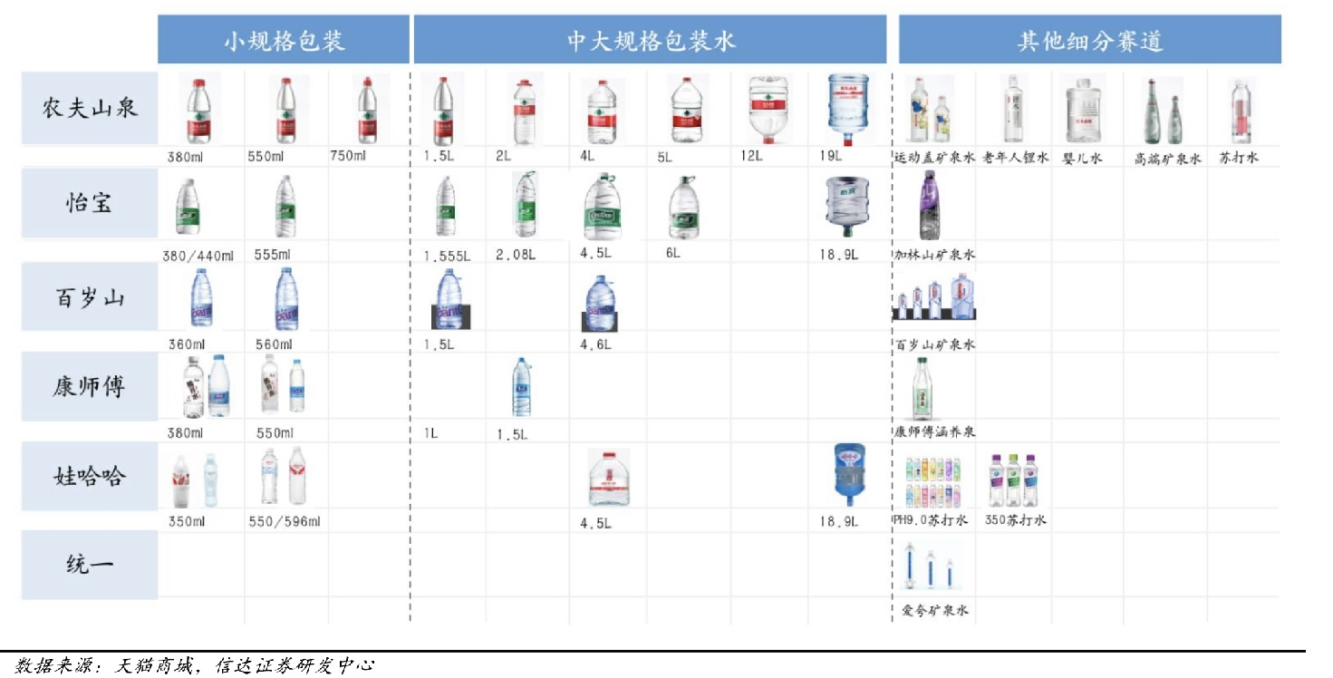 根據(jù)信達(dá)證券的統(tǒng)計,農(nóng)夫山泉在中大規(guī)格包裝水的產(chǎn)品布局最為細(xì)致,從1.5L-19L之間配置了6款產(chǎn)品,可以更好地滿足不同訴求的消費者。