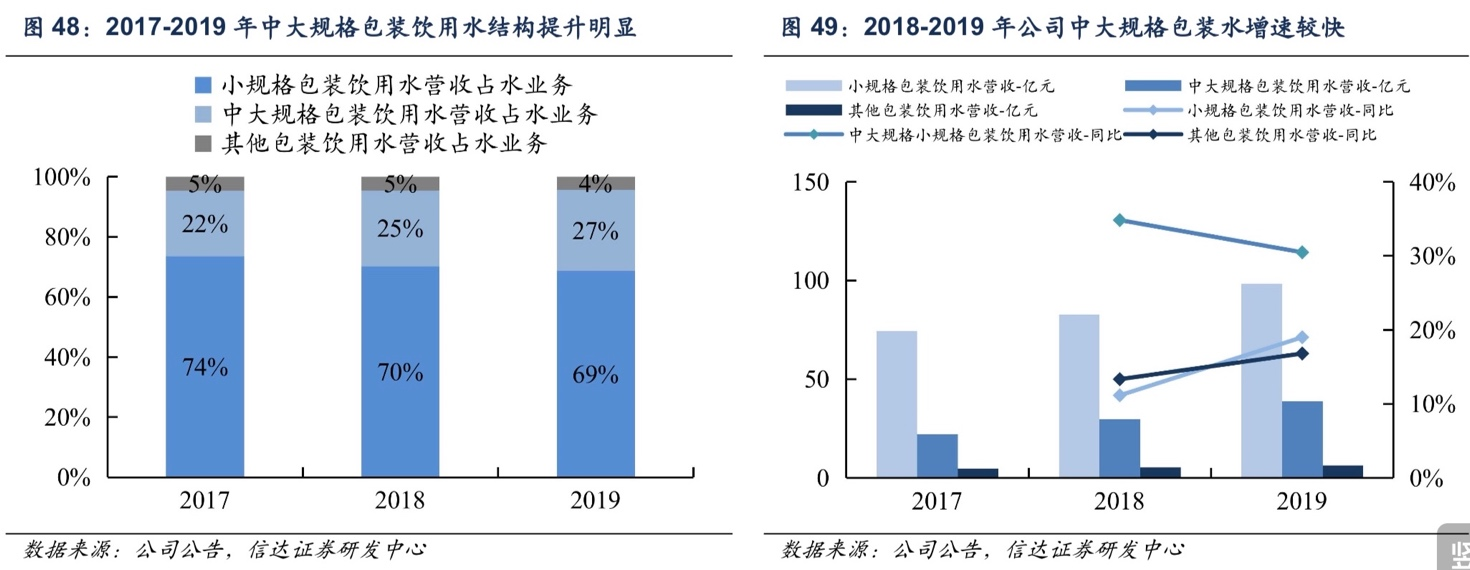 從農(nóng)夫山泉的業(yè)績結(jié)構(gòu)似乎也可以印證這一點。自2017年,農(nóng)夫山泉中大規(guī)格包裝飲用水營收占水業(yè)務(wù)的比例在持續(xù)上升,此外,其中大規(guī)格包裝水的增速也是遠(yuǎn)高于小規(guī)格和其他包裝飲用水。