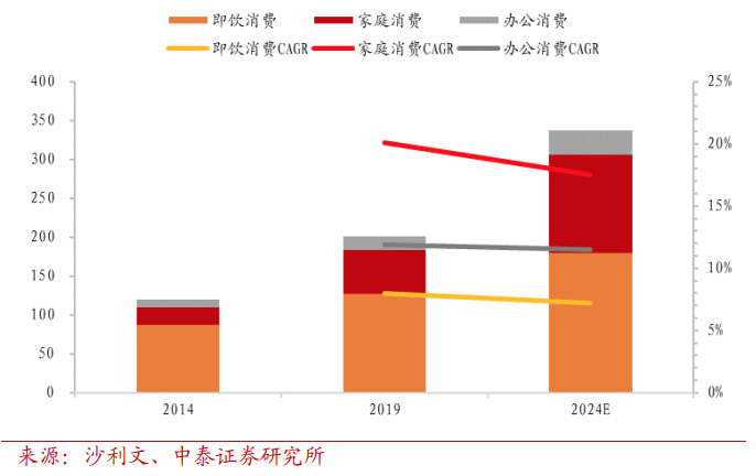 根據(jù)沙利文的統(tǒng)計,家庭消費是當(dāng)下包裝水增速最快的消費場景,預(yù)計自2019年到2024年的CAGR可以達(dá)到17.5%,其次是辦公場景,或?qū)⒈3?0%以上的增速。