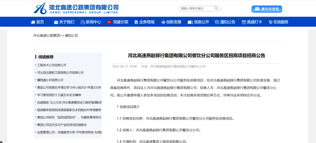 河北高速公路鐵路集團(tuán)有限公司2022年6月在官網(wǎng)上發(fā)出招商公告為例,服務(wù)區(qū)餐飲基本上沒(méi)對(duì)餐飲經(jīng)營(yíng)人提什么條件。