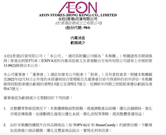 公告顯示,永旺預(yù)計(jì)2022年度錄得控股股東應(yīng)占虧損約港幣2.3億元至港幣2.7億元,而2021年同期之控股股東應(yīng)占虧損為港幣4.7億元,同比大幅減虧。