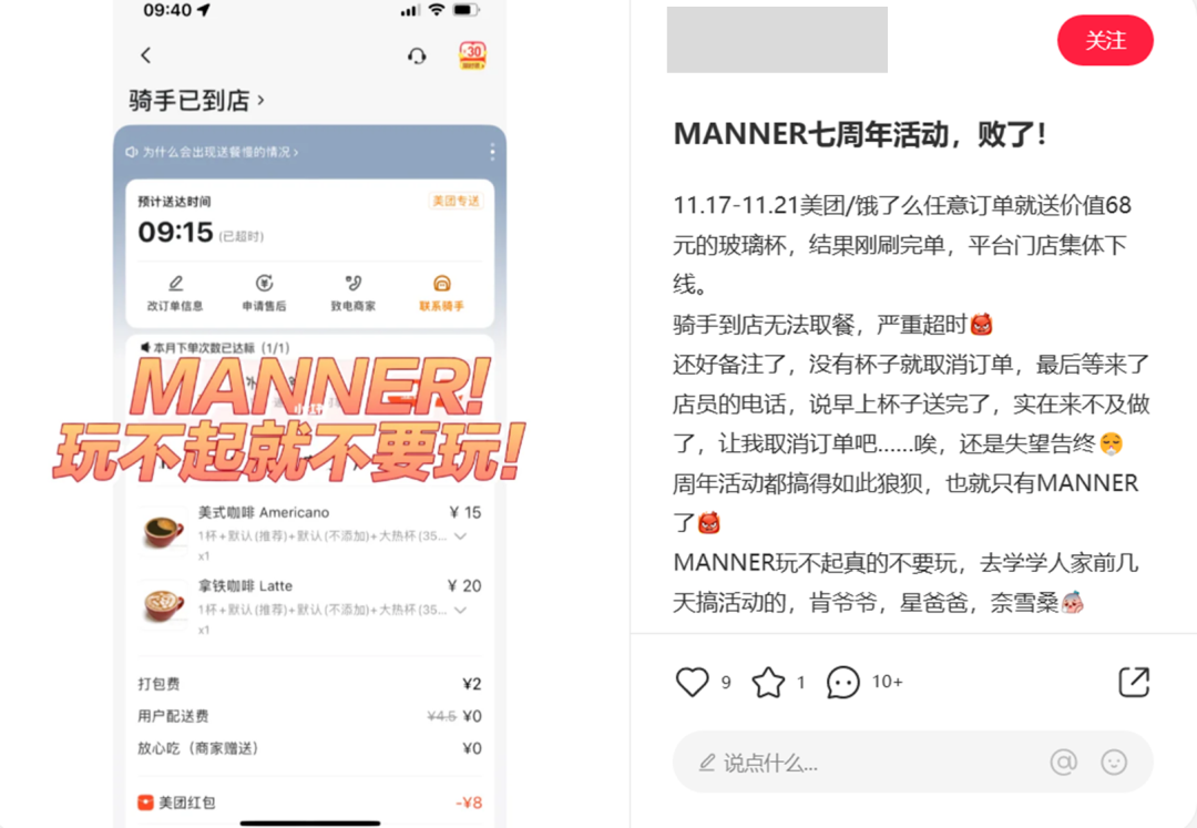 Manner七周年慶時,推出限定周邊回饋,“任意下單可獲贈68元的限定隨手杯1個”。但活動僅限外賣平臺,引發(fā)“瞬時爆單"。多地Manner門店因訂單激增、供應不足致大面積間歇停業(yè)。不少消費者被贈品吸引而下單,收到咖啡時贈品卻已告罄?胺Q反向營銷。