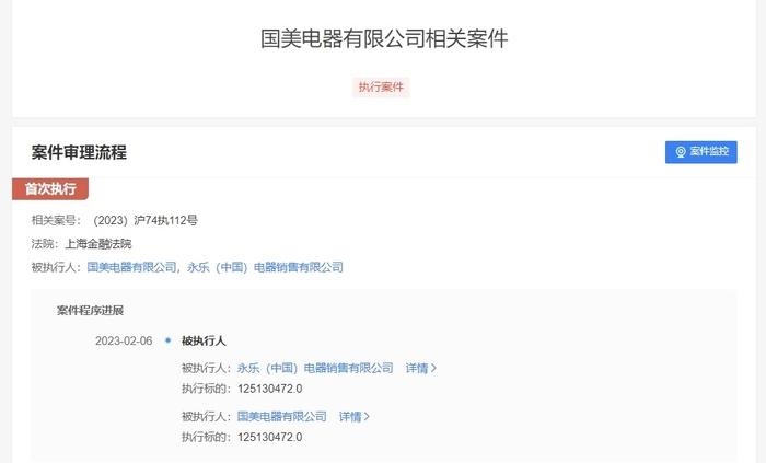2月6日,國美電器有限公司、永樂(中國)電器銷售有限公司新增一則被執(zhí)行人信息。天眼查顯示,該執(zhí)行標的1.25億余元,執(zhí)行法院為上海金融法院。