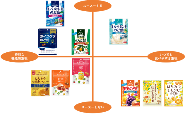 由此,經(jīng)過反復試做,添加草本成分的健康潤喉糖誕生。既有舒緩咽喉不適的功能性,又具有嗜好品的美味,是一款適合成年人的糖果。