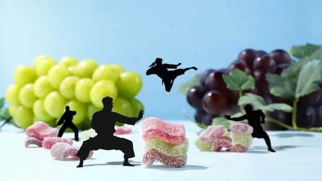 今年1月發(fā)售的”武道達人軟糖“(カンデミーナグミぶどうの達人),則將軟糖做成了瓦片狀,可片片疊放食用,疊放層數(shù)不同,口感也會發(fā)生變化,可以挑戰(zhàn)最多能疊放多少層,成為了社交媒體軟件上的熱門話題。