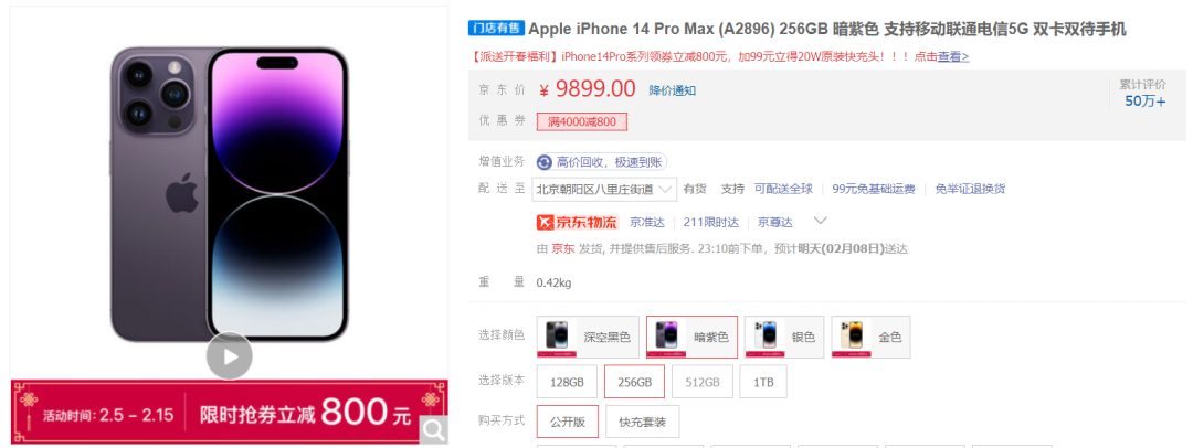 “剛到手就虧了八百,快遞還等了半個月。”家住四川的彥宇向盒飯財經(jīng)表示。上周末他剛剛收到了在官網(wǎng)花9899元購買的iPhone14 Pro Max,但到了周一(2月6日),這款手機在京東直營店便降價800元。