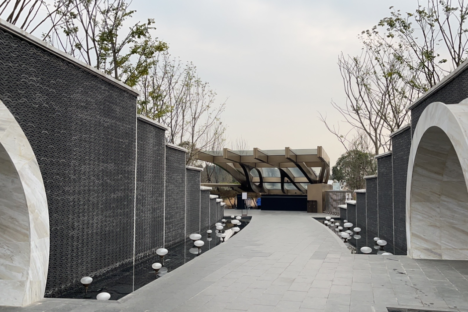 為了避免兩個(gè)空間的沖突感,從公園進(jìn)入地下的入口處,SKP用傳統(tǒng)中式的黑白色調(diào)的瓦片墻構(gòu)筑的曲徑連接,以作為從公共空間到地下“宮殿”的緩沖和過(guò)渡。