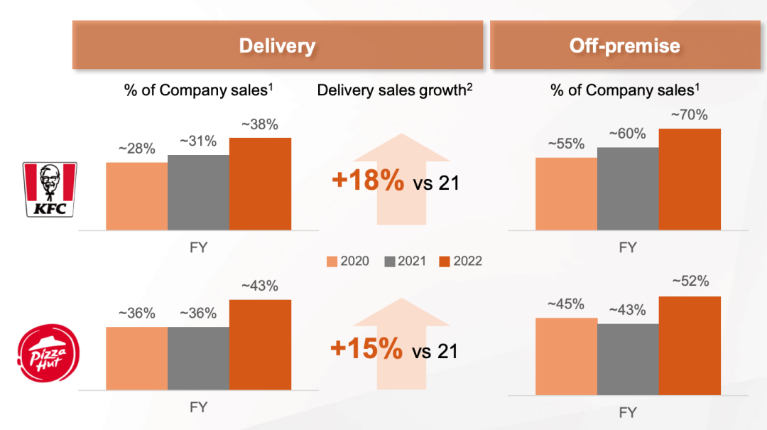 能在壓力中保持韌性,“非堂食業(yè)務(wù)”是重中之重!胺翘檬硺I(yè)務(wù)”包含外賣、外帶等業(yè)務(wù),根據(jù)官方信息,肯德基外賣業(yè)務(wù)銷售額較2021年提升了18%,必勝客提升了15%。2022年,肯德基“非堂食業(yè)務(wù)”銷售占比達(dá)到了70%,必勝客達(dá)到了52%。