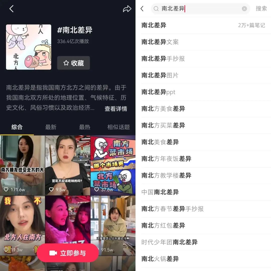 抖音上,相關(guān)的“#南北差異”話題播放量就達(dá)到336.4億次;小紅書(shū)上,有關(guān)南北差異的筆記有2萬(wàn)多條,不少相關(guān)筆記的點(diǎn)贊突破了10萬(wàn);微博上,也有著“南北方過(guò)年的差異”“壓歲錢的南北差異”等相關(guān)熱搜。