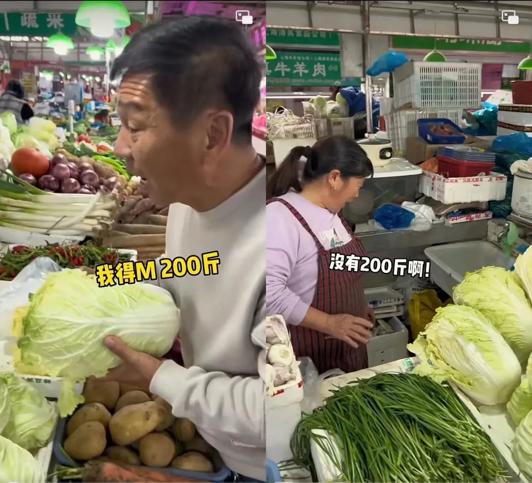 南方菜場(chǎng)里,東北大爺張口要買200斤大白菜腌酸菜,攤主把所有的大白菜拿出來(lái)還不夠,又從隔壁攤位借了一籮筐大白菜,最后也沒(méi)有湊夠200斤大白菜,大爺也只能無(wú)奈表示“那我就少吃點(diǎn)吧”。