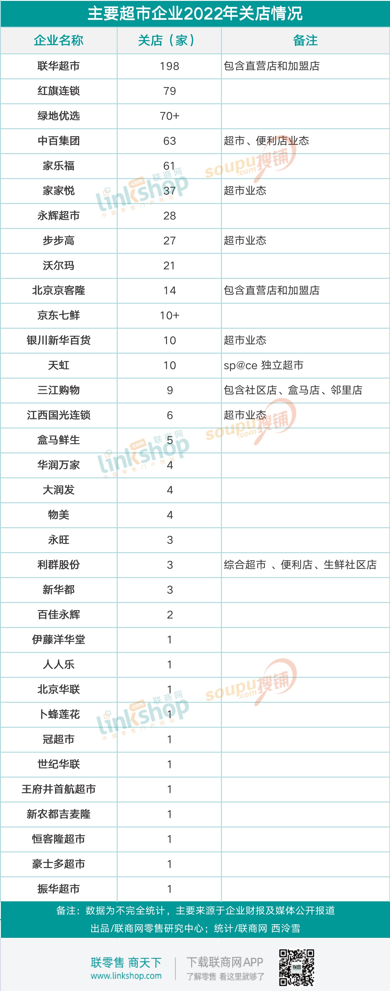 據(jù)聯(lián)商網(wǎng)零售研究中心不完全統(tǒng)計,聯(lián)華超市、紅旗連鎖、永輝超市、中百集團、綠地優(yōu)選、京東七鮮等34家超市企業(yè)2022年關(guān)閉門店超過680家。