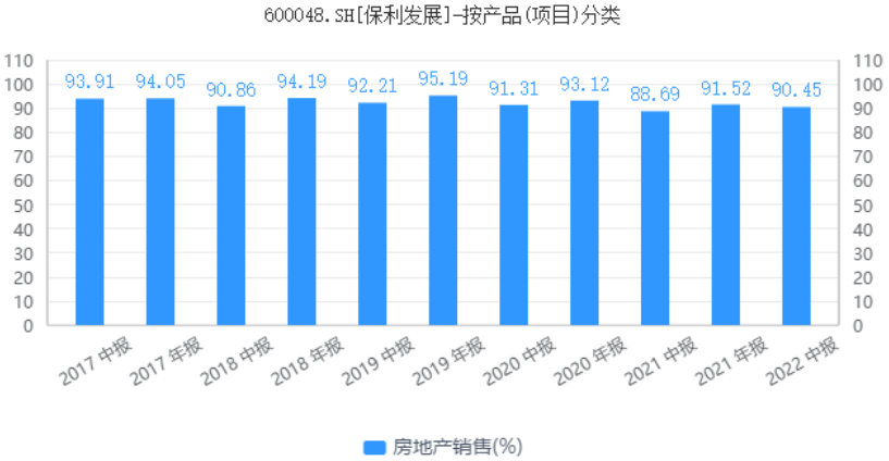 整體來看,更名后的保利發(fā)展在多元化發(fā)展上并未實現(xiàn)實質(zhì)性突破。數(shù)據(jù)顯示,2018-2021年,保利房地產(chǎn)銷售業(yè)務(wù)收入占比始終維持在90%以上。2022年上半年,保利房地產(chǎn)銷售業(yè)務(wù)收入占比仍高達90.45%,物業(yè)、金融等其他業(yè)務(wù)占比不足10%。