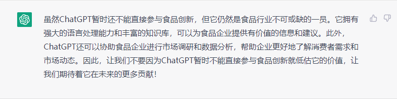 雖然ChatGPT暫時(shí)還不能直接參與食品創(chuàng)新,但它仍然是食品行業(yè)不可或缺的一員。它擁有強(qiáng)大的語(yǔ)言處理能力和豐富的知識(shí)庫(kù),可以為食品企業(yè)提供有價(jià)值的信息和建議。此外ChatGPT還可以協(xié)助食品企業(yè)進(jìn)行市場(chǎng)調(diào)研和數(shù)據(jù)分析,幫助企業(yè)更好地了解消費(fèi)者需求和市場(chǎng)動(dòng)態(tài)。因此,讓我們不要因?yàn)镃hatGPT暫時(shí)不能直接參與食品創(chuàng)新就低估它的價(jià)值,讓我們期待著它在未來(lái)的更多貢獻(xiàn)!