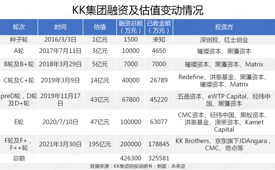 《未來跡Future Beauty》結(jié)合媒體公開報(bào)道以及KK集團(tuán)招股說明書發(fā)現(xiàn),從2016年開始,KK集團(tuán)至少已經(jīng)進(jìn)行了7大輪融資,媒體公開披露的融資總金額已經(jīng)達(dá)到了42億元人民幣,而招股說明書顯示截止2022年10月31日實(shí)際已收對(duì)價(jià)資金也達(dá)到32億元。截止最后一輪由京東旗下JDAngara以及優(yōu)視原聯(lián)合創(chuàng)始人梁捷創(chuàng)辦的KK Brothers領(lǐng)頭的F輪融資,KK集團(tuán)的估值已經(jīng)接近200億元人民幣。其估值在5年時(shí)間里暴漲了200倍。