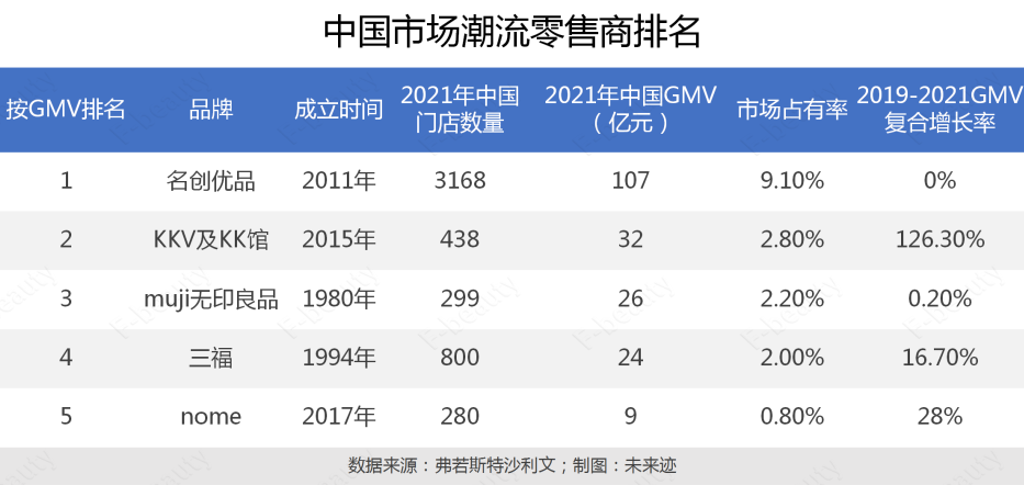 根據(jù)弗若斯特沙利文提供的數(shù)據(jù),名創(chuàng)優(yōu)品是2021年中國市場占有率最高的潮流零售商,市場占有率為9.1%;KK集團(tuán)旗下KKV和KK館綜合起來排名第二。