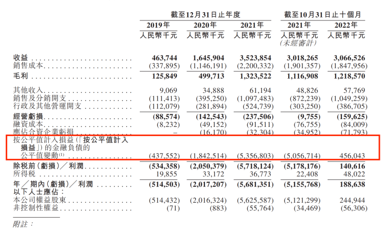 招股說明書顯示,2019年到2022年10月31日,KK集團(tuán)按公平值計(jì)入損益的金融負(fù)債的變動(dòng)值金額分別為4.38億元、18.43億元、53.57億元以及4.56億元。