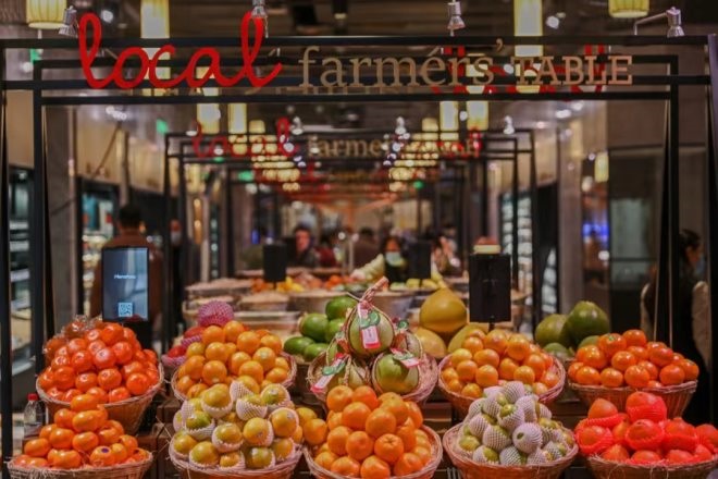 在這里,消費(fèi)者總能發(fā)現(xiàn)其他地方買(mǎi)不到的果蔬。這是因?yàn)椋冒倏蜕釛壛耸忻嫔铣R?jiàn)的品牌,而是選擇了當(dāng)季、本地以及個(gè)性化的果蔬產(chǎn)品,在食品館的果蔬區(qū)入口位置可以看到當(dāng)季推薦食材的海報(bào),培養(yǎng)客人“食在當(dāng)季”的飲食習(xí)慣。