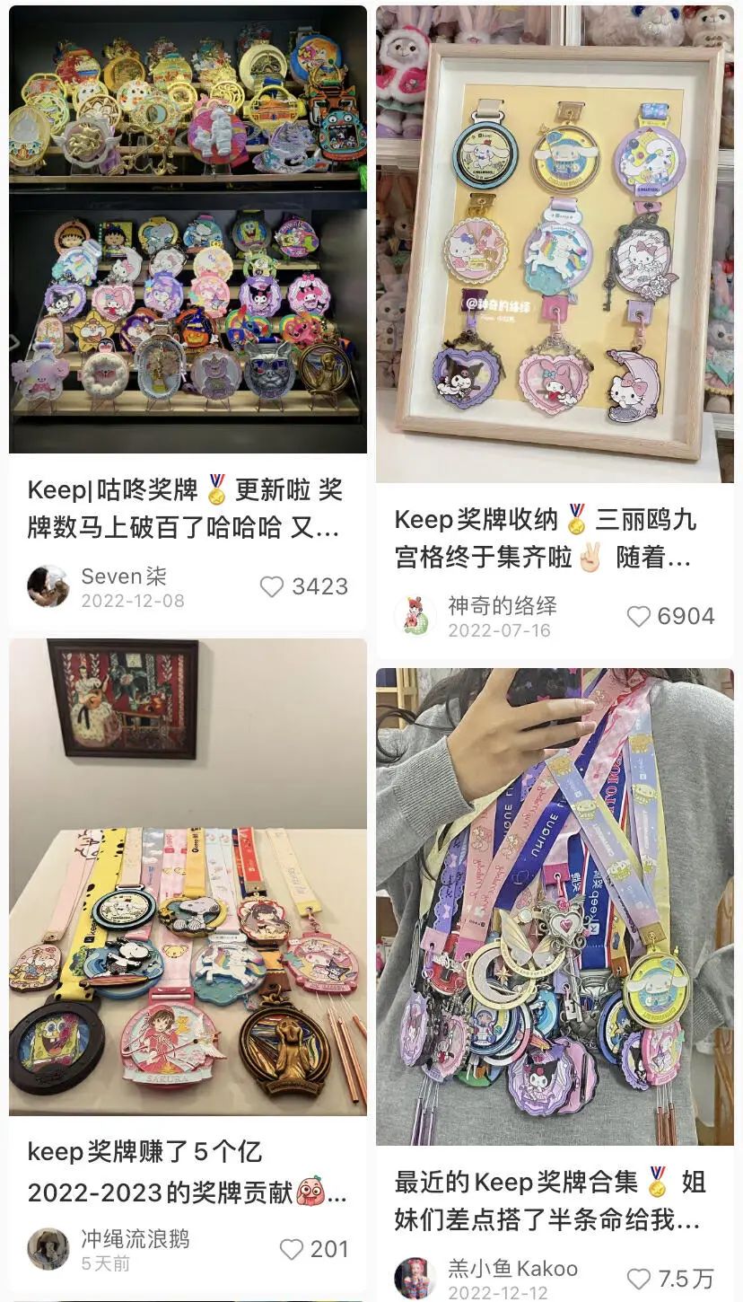 現(xiàn)在Keep獎(jiǎng)牌正在超越單純的營(yíng)銷(xiāo)活動(dòng),向一場(chǎng)聲勢(shì)浩大的文化現(xiàn)象奔去。通過(guò)和不同經(jīng)典iP和亞文化的連接,Keep獎(jiǎng)牌逐漸演變成一種社交籌碼。有獎(jiǎng)牌的人可以炫耀,小紅書(shū)上一張張掛滿一墻的獎(jiǎng)牌似乎在暗戳戳地說(shuō),“我的持有者,超潮,超健康”。