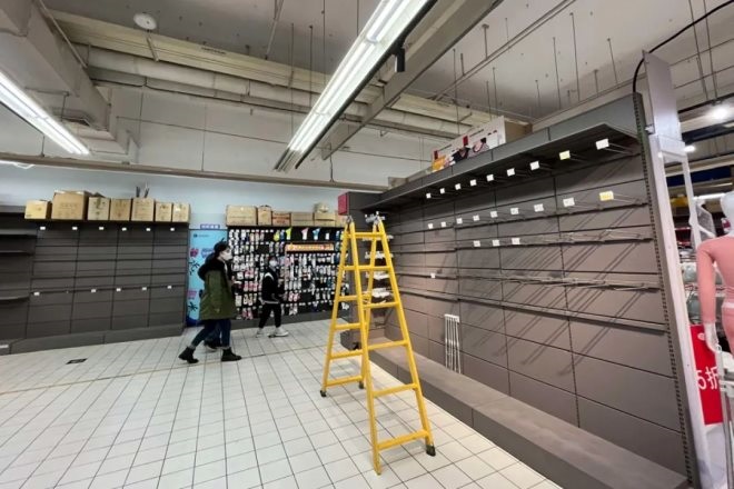 直至今日,包括北京、上海、天津、沈陽(yáng)、無(wú)錫等在內(nèi)的多個(gè)城市,家樂(lè)福超市均進(jìn)入“混亂期”,冷藏柜清空,連排的貨架空無(wú)一物,帶包裝紙箱的貨物被暴力扯開(kāi)口子扔在過(guò)道,貼上價(jià)簽直接開(kāi)賣(mài)。