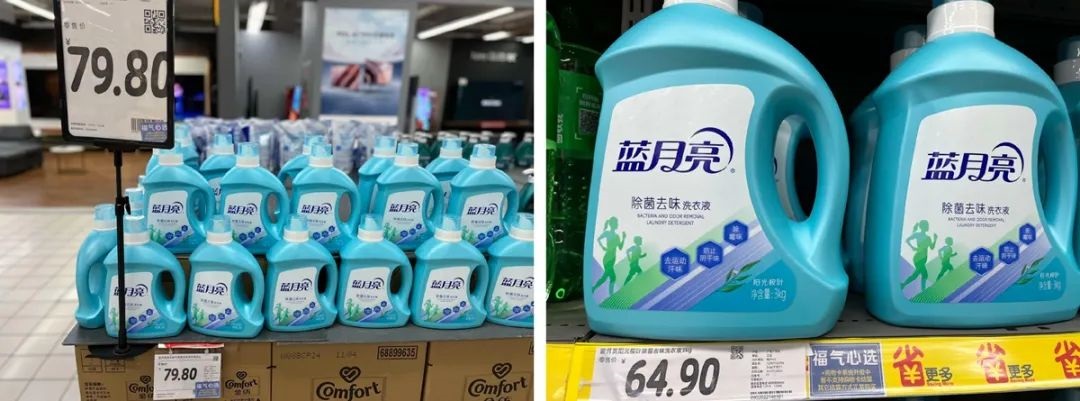 零售君注意到,一款在藍(lán)月亮天貓旗艦店售價(jià)46.9元的2kg瓶裝洗衣液,在家樂(lè)福售價(jià)79.8元,離譜的是,3kg瓶裝又標(biāo)價(jià)64.9元,且都標(biāo)注了“購(gòu)物卡系統(tǒng)升級(jí),暫不支持購(gòu)物卡結(jié)算”字樣。