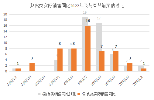 14、熟食類(包含主食加工、散裝肉制品、熟食加工、小菜、配菜)的表現(xiàn)較為平穩(wěn),銷售同比2022年增長20%以上的有1家,增長15-20%的有3家,增長10-15%的有7家,增長5-10%的有7家,增長5%以內(nèi)的有16家,有19家同比下降。下降企業(yè)中,有受南北飲食差異、人員返鄉(xiāng)等因素影響。