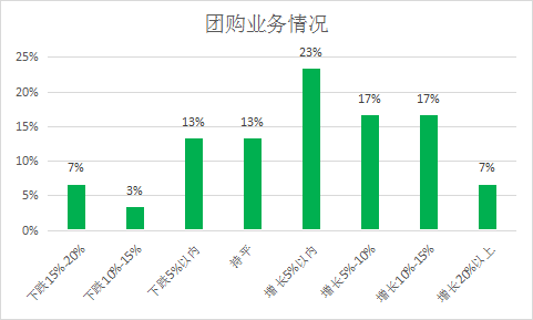 團購業(yè)務(wù)對于春節(jié)銷售也起到至關(guān)重要的作,調(diào)查顯示23%的企業(yè)增長幅度在5%以內(nèi),17%的企業(yè)增長10-15%,17%的企業(yè)增長幅度在5-10%,23%的企業(yè)增長幅度20%以上,持平的企業(yè)占比13%,而下跌的企業(yè)僅為23%。