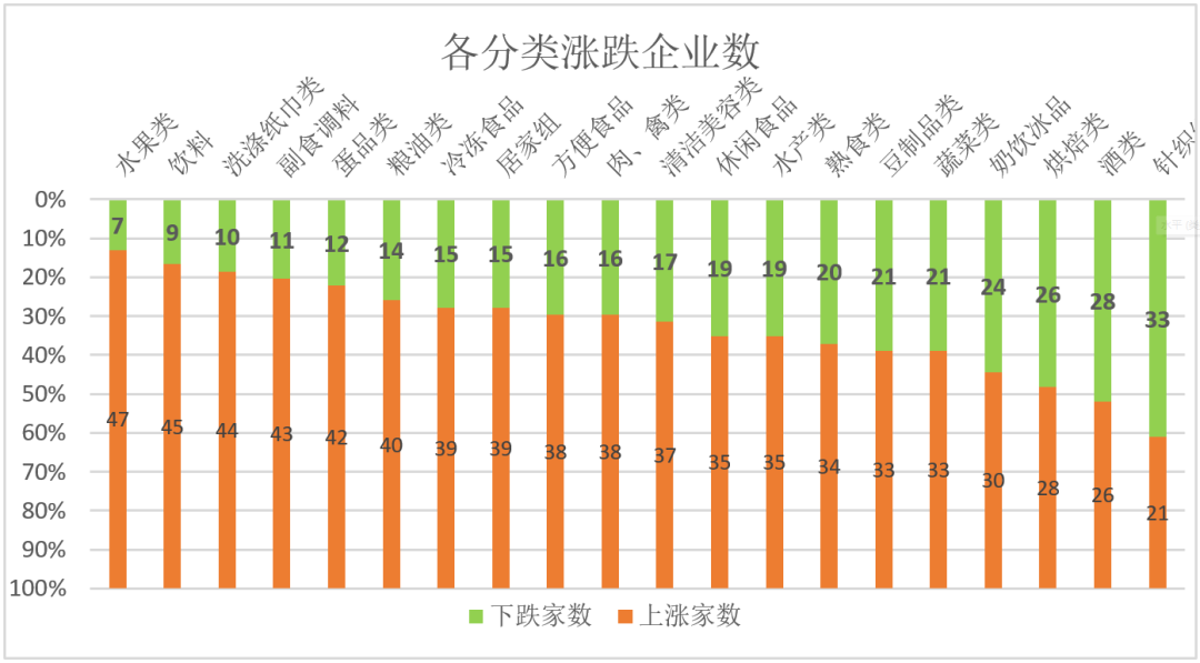 20個大分類實際銷售各商品分類表現(xiàn)不一,和預(yù)期相比差距較大的品類中,超出預(yù)期的主要有水果、飲料、洗滌紙巾類等分類,不如預(yù)期的主要有酒類、奶飲冰飲、烘焙等分類。具體表現(xiàn)如下: