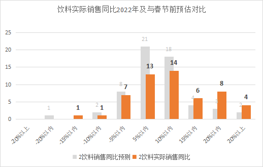 2、飲料(瓶裝水、功能飲料、茶飲、果蔬飲料、碳酸飲料、含乳飲料、沖飲、咖啡)的表現(xiàn)超預(yù)期,銷售同比2022年增長20%以上的有4家,增長15-20%的有8家,增長10-15%的有6家,增長5-10%的有14家,增長5%以內(nèi)的有13家,僅有9家同比輕微下降。外出、過節(jié)、聚餐增多,消費回暖,大包裝飲料及禮盒類增長較好。