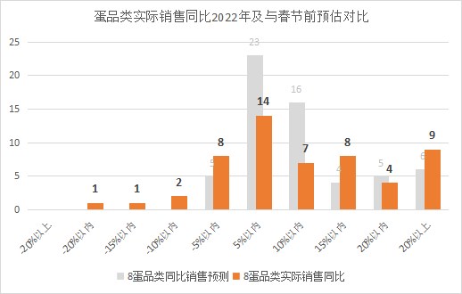 5、蛋品類(鮮蛋、加工蛋品)的表現(xiàn)也不錯,增福優(yōu)于預(yù)期銷售,同比2022年增長20%以上的有9家,增長15-20%的有4家,增長10-15%的有8家,增長5-10%的有7家,增長5%以內(nèi)的有14家,只有12家同比下降。