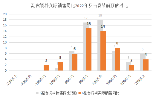 4、副食調(diào)料(調(diào)味油汁、調(diào)味粉晶、醬制品、腐乳、醬、干菜、海味、配料、罐頭、蜂蜜果醬)的表現(xiàn)符合年初預(yù)期,銷售同比2022年增長20%以上的有4家,增長15-20%的有2家,增長10-15%的有8家,增長5-10%的有14家,增長5%以內(nèi)的有15家,僅有11家同比下降;丶疫^年,在家做飯,家中小聚效應(yīng)明顯。同比下降企業(yè)主要原因與春節(jié)返鄉(xiāng)人口流動相關(guān)。