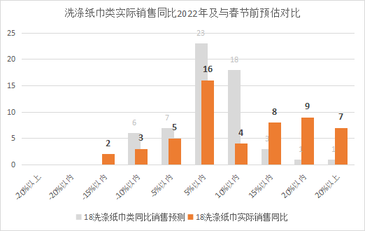 3、洗滌紙巾類(衛(wèi)生紙、兒童婦女衛(wèi)生用品、濕巾、抽紙、洗衣用劑、家居清潔)的表現(xiàn)較為亮眼,銷售同比2022年上漲20%以上的有7家,上漲15-20%的有9家,上漲10-15%的有8家,上漲5-10%的有4家,5%微漲的有16家,僅有10家同比下跌。