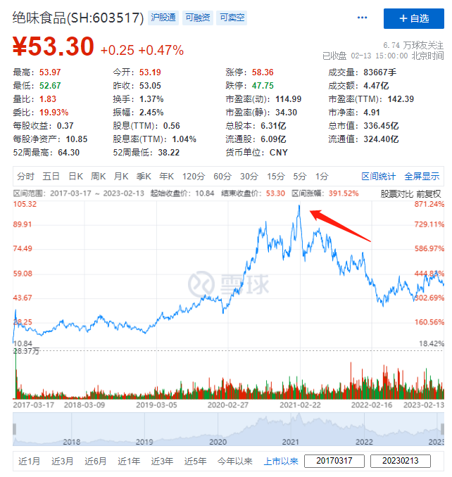 截至2月13日收盤,絕味食品最新股價為53.3元每股,較2021年初的超102元每股的股價最高點,股價已經(jīng)跌去近五成,兩年間市值蒸發(fā)三百多億。
