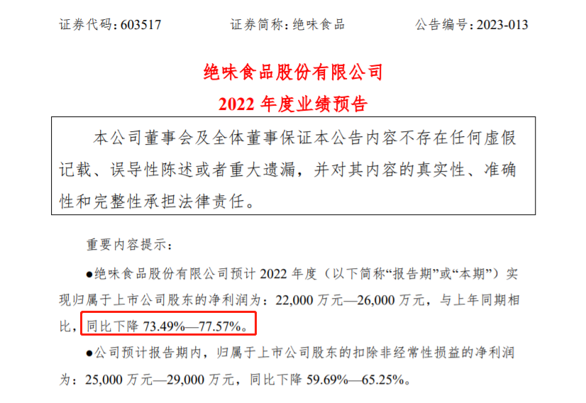 絕味食品在2022全年實現(xiàn)歸屬于上市公司股東的凈利潤預計在2.2億到2.6億元之間,較去年9.8億元的凈利潤,同比下滑幅度超過七成。