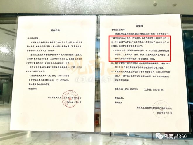 公告內容還稱,2023年2月19日前紅谷灘商場內、外,以及在此之前制作的所有涉及“紅星美凱龍”商標、標識、紅星美凱龍代言人姓名、肖像等無形資產的物料載體,將會被摘除、銷毀。