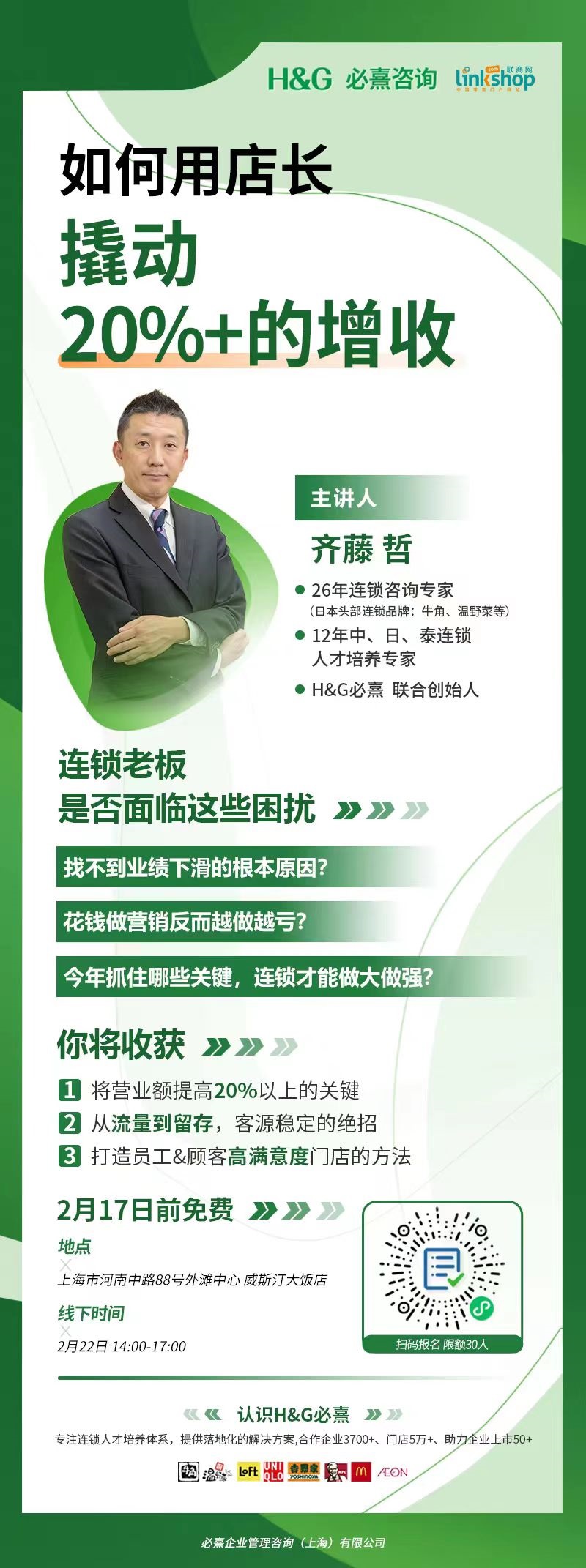 我們請(qǐng)到了日本H&G的聯(lián)合創(chuàng)始人、有26年連鎖咨詢(xún)&培訓(xùn)經(jīng)驗(yàn)的齊藤先生來(lái)給我們大家做分享。