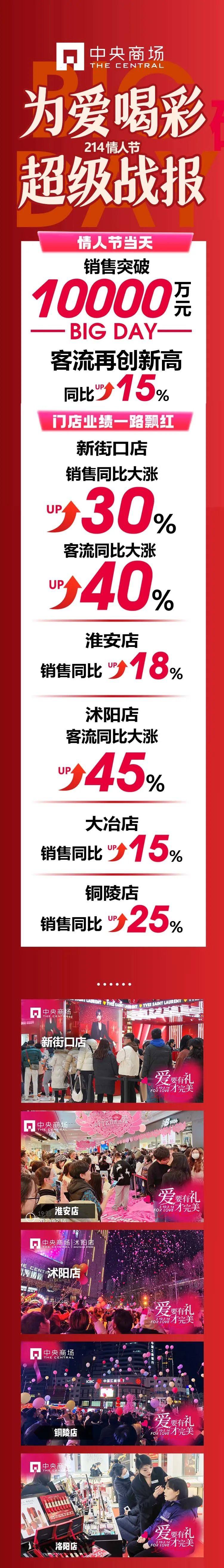 中央商場14城16店6000+品牌兩百多萬件商品聯(lián)袂打造“愛要有禮才完美”大型城市浪漫情人節(jié),與城市,同心意!全集團情人節(jié)當(dāng)天銷售及客流再創(chuàng)新高,突破億元大關(guān)。