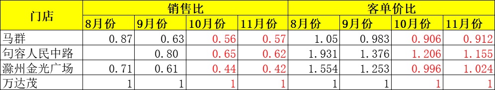 注:以萬達茂銷售和客單價為1,對比其他門店的銷售和客單價都處于下降趨勢。