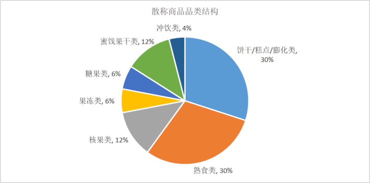 大類方面,零食店一般分為散稱商品和常規(guī)商品,兩者商品數(shù)各占50%左右。下一級分類中,各分類商品數(shù)參考如下: