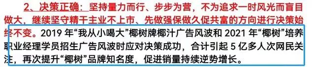 2022年初,椰樹集團(tuán)發(fā)布的《開門紅報喜》中就曾提到,2019年“從小喝到大”廣告風(fēng)波和2021年招生廣告風(fēng)波,應(yīng)對決策成功,合計引起5億多人次的網(wǎng)民關(guān)注,提升了椰樹品牌的知名度,促進(jìn)銷量持續(xù)增長。