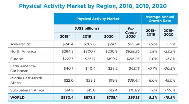 2018-2020,全球運(yùn)動(dòng)市場(chǎng)規(guī)模。按地區(qū)劃分,年增長(zhǎng)率均有所下滑。圖源:GWI官網(wǎng)