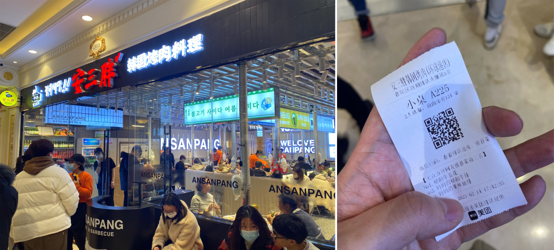 一旁的巴奴火鍋同樣火爆,線上排隊90多號。17:42,安三胖韓國烤肉排隊124桌。18:17,炙楽町·赤焰日料小聚薈排隊到了117桌。