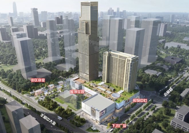 從此前公開的效果圖上看,商業(yè)部分規(guī)劃了購物中心、街區(qū)、屋頂花園和下沉式廣場等業(yè)態(tài)。開工時間和竣工時間都是2023年。