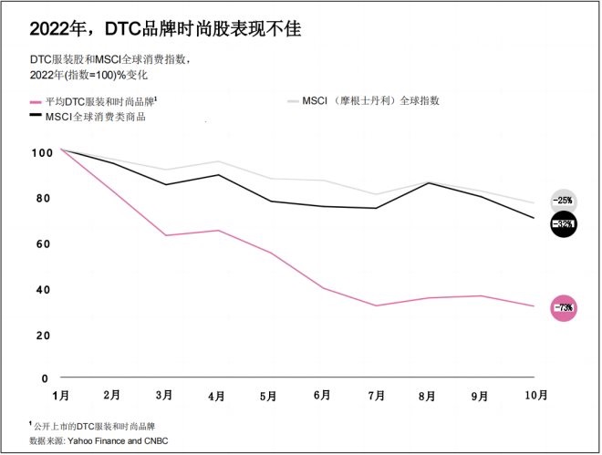 但在2022年,純數(shù)字化營(yíng)銷模式出現(xiàn)了問(wèn)題。隨著DTC品牌開(kāi)始上市,它們的股票價(jià)格受到影響。10個(gè)服裝DTC品牌的股價(jià)在2022年前三季度下跌了約70%,而同期MSCI世界非必需消費(fèi)品指數(shù)的跌幅為32%。