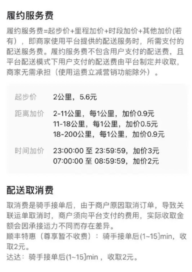 對(duì)于商家而言,因?yàn)榕渌唾M(fèi)用并不包含在平臺(tái)抽傭中,因此若商家使用平臺(tái)提供的配送服務(wù),需要支付履約服務(wù)費(fèi)。抖音的履約服務(wù)費(fèi)分為起步價(jià)+里程加價(jià)+時(shí)段加價(jià)+其他加價(jià)。通過(guò)整體測(cè)算得知,抖音的履約服務(wù)費(fèi)機(jī)制更偏向高客單價(jià)以及遠(yuǎn)距離配送的商家。